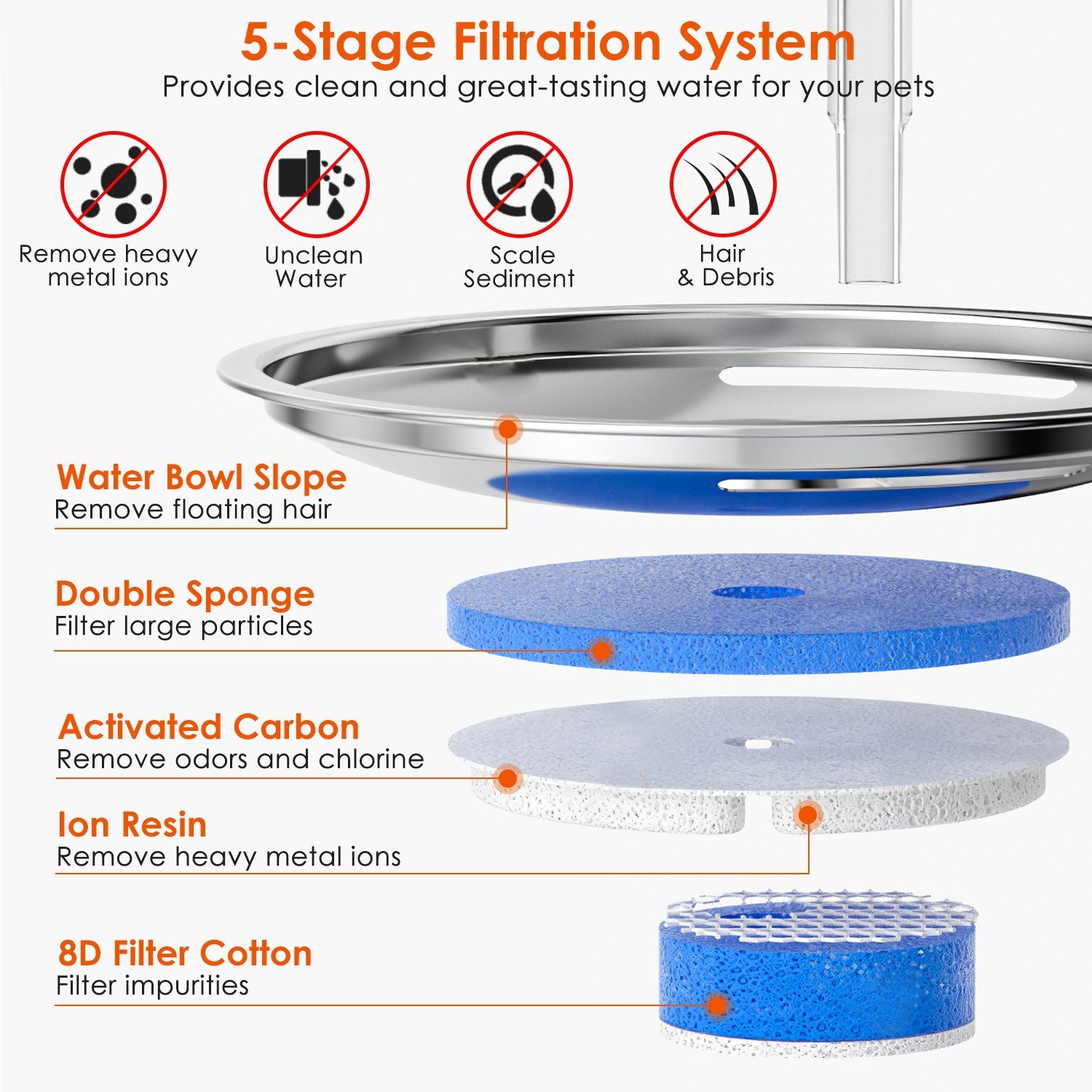 *5-Stage Filtration System*:Featured with a 5-stage filtration system,our pet water fountain effectively removes impurities,odors,and chlorine from the water,providing clean and great-tasting water for your pets.