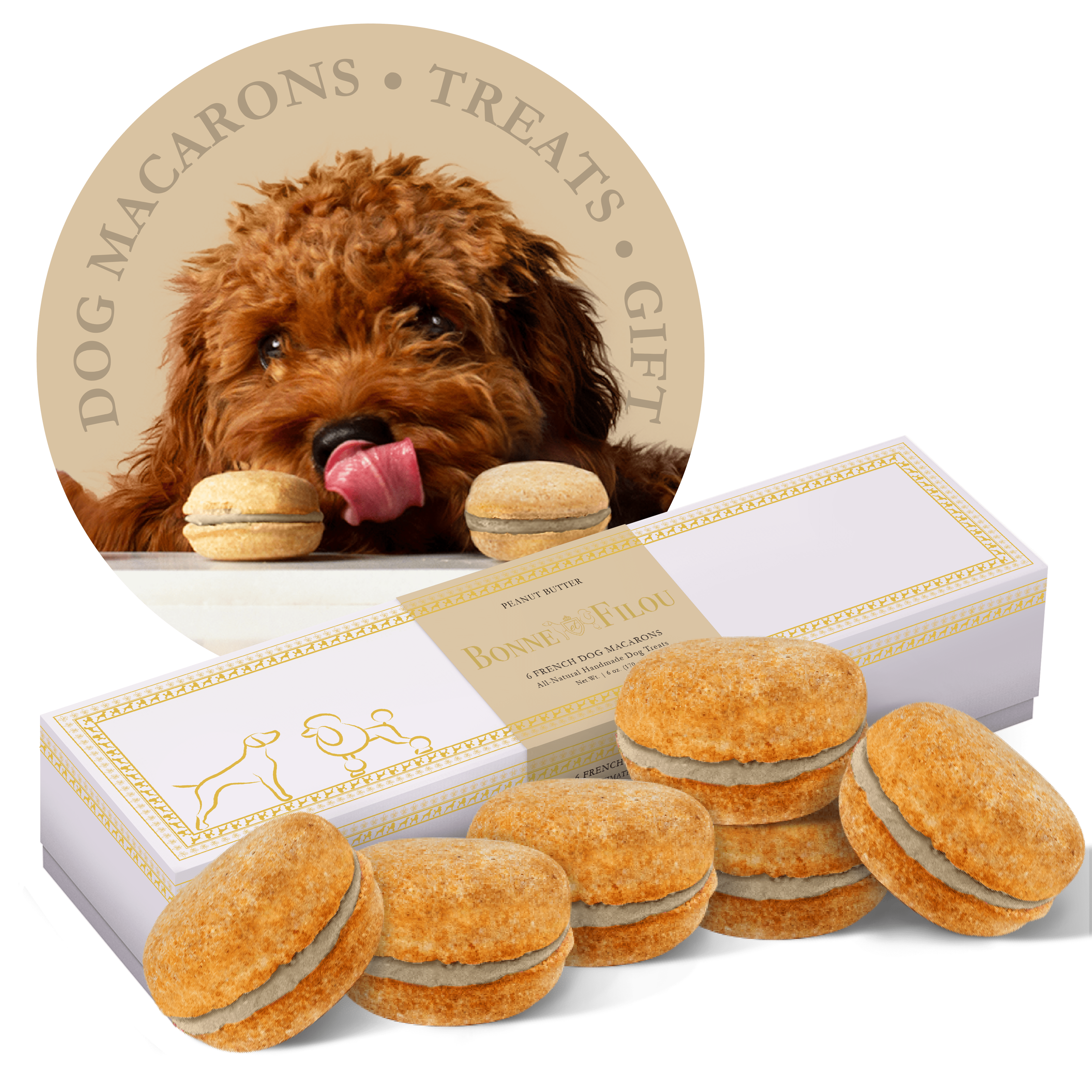 Dog Macarons - Count of 6 (Dog Treats | Dog Gifts)This box of our premium macaron treats features: - Box of 6 dog macarons- Handmade with premium human-grade ingredients in the USA- 100% natural; corn-free; wheat-free ingredients- No artificial coloring or preservatives- Hard treat designed for a long-lasting chew- Shelf life of 12+ months | No need for refrigerationBase Recipe Ingredients: Oat Flour; Honey; Coconut Oil; All-Natural Flavored Yogurt FillingFeeding Instructions:Our treats are hard; designed for a long-lasting chew. For elderly or small dogs; we recommend breaking the treat in smaller pieces (by twisting both sides).